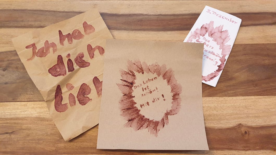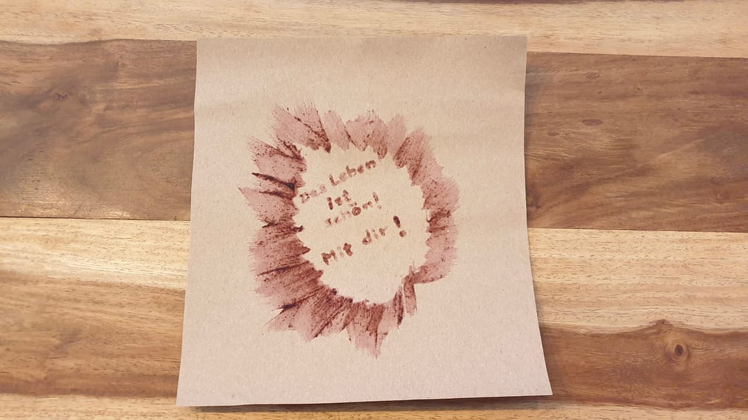 In die ausgesparte Blattmitte schreibst du nun deine Nachricht oder deinen Spruch. Ich habe hier mit einem kleinen Pinsel und Rotebeetesaft gearbeitet. Das Ganze hat vielleicht 10 Minuten gedauert. Einschließlich Anmischen der Farbe und Papierbeschaffung.