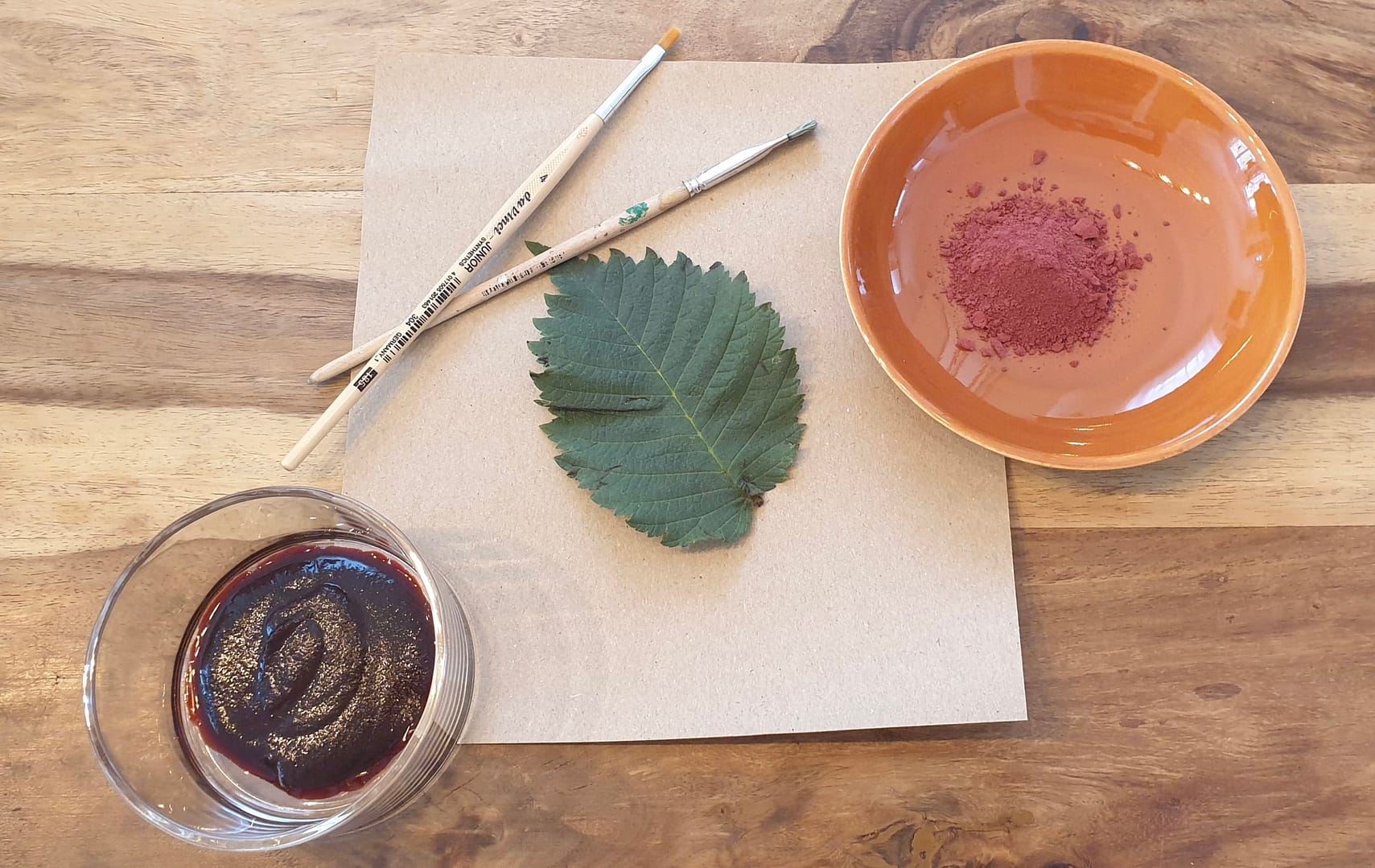 Ist das vollbracht, kannst du zu gegebener Zeit deine getrockneten Blätter auf die aufbewahrte Pappe legen und mit einem Pinsel von der Blattmitte nach außen zum Kartenrand mit beliebiger Farbe (Kaffeesud, Rotebeetesaft o.Ä) streichen. Am Ende nimmst du das Blatt weg. Deiner malerischen Fantasie sind dabei keine Grenzen gesetzt.