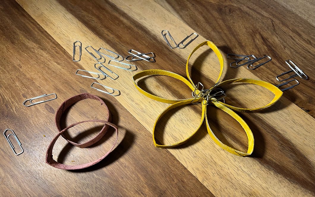 Ordne deine Ringe an und klebe sie zusammen. Hierfür kannst du eine Papierkleber oder eine Heißklebepistole benutzen. Fixiere die Klebestellen mit Büroklammern (Bild 4).