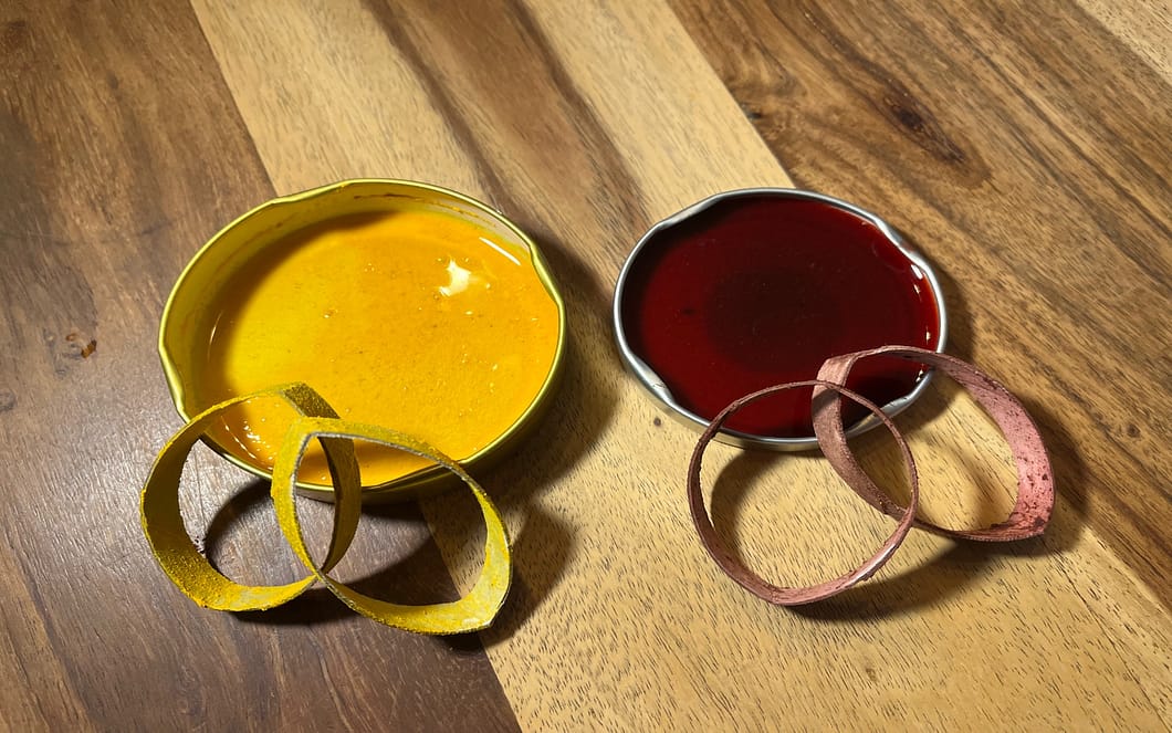 Bemale die Ringe in Farben deiner Wahl. Hier kannst du auch selbst gemachte Farben aus Rote-Beete-Pulver oder Kurkuma verwenden (Bild 3). Dazu rührst du ein Löffelchen Pulver mit etwas Wasser an. Wichtig ist aber, dass die Farben nicht zu feucht sind, damit sie die Pappe nicht weich machen. Und: Du solltest die Ringe nach dem Bemalen in Ruhe trocknen lassen. Die Paste ist ein wenig bröselig. Wenn die Ringe getrocknet sind, kannst du sie mit einem Pinsel abstäuben.